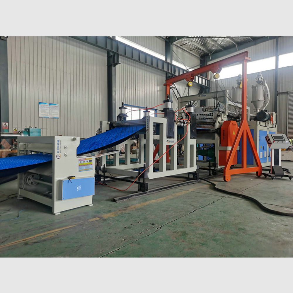 The line consists of Automatic feeding system and drying system,Single screw extruder,Two layer composite flat mould,Forming unit,Haul-off unit,Trimming unit,Cutting unit,Winder and PLC electric control system.Two layer flat mould is specially designed with unique internal flow distribution,double-channel design for material,the heating method of the flat die head adopts the heating rods.The unique design and synchronous composite function of forming unit,can compound non-woven fabrice under the plastic grass lawn/mat,then they are firmly bonded.All electric parts of this line adopts famous brand,such as SIEMENSE,SCHNEIDER,ABB,PARK etc;the pneumatic parts adopt the AIRTAC brand of Taiwan,it makes the machine running stably.
